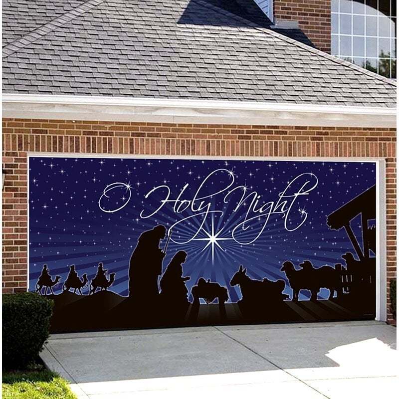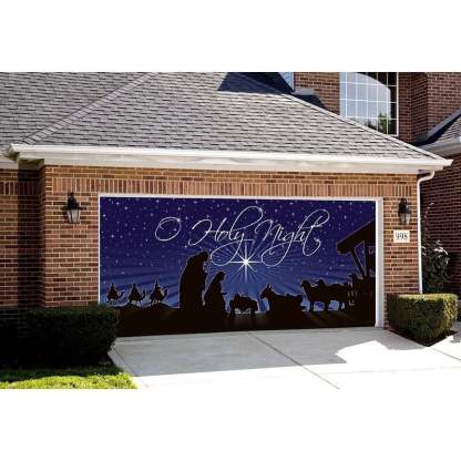 Nativity O Holy Night - Christmas Garage Door Decor - O Holy Night. The stars are brightly shining. It is the night of the dear Saviour's birth. Fits Standard 7 ft. x 16 ft. Garage Door. Flat or Paneled Garage Doors. Garage Door Decor is a Holiday Decoration that you hang on your garage door in a matter of just a few minutes. The Garage Door Decor makes it appear to people passing by that the garage door is open and you have a fun Holiday scene in your garage. created and manufactures the Garage Door Decor and there is nothing else that compares to the Garage Door Decor in Quality, Designs and Pricing. Garage Door Decor is designed to work on standard roll up doors and flat doors. All Garage Door Decors are made of the highest quality materials and construction for many, many years of enjoyment. The Garage Door Decor comes to you fully assembled in a reusable storage box and ready to hang on your door. The hardware we have developed allows you to hang the Garage Door Decor in a matter of just a few minutes and you are able to use your garage door as you normally would. There is nothing attached directly to the door (tapes, screws, etc.).
