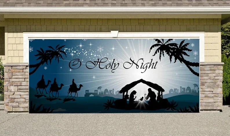 Nativity O Holy Night - Christmas Garage Door Decor - O Holy Night. The stars are brightly shining. It is the night of the dear Saviour's birth. Fits Standard 7 ft. x 16 ft. Garage Door. Flat or Paneled Garage Doors. Garage Door Decor is a Holiday Decoration that you hang on your garage door in a matter of just a few minutes. The Garage Door Decor makes it appear to people passing by that the garage door is open and you have a fun Holiday scene in your garage.  created and manufactures the Garage Door Decor and there is nothing else that compares to the Garage Door Decor in Quality, Designs and Pricing. Garage Door Decor is designed to work on standard roll up doors and flat doors. All Garage Door Decors are made of the highest quality materials and construction for many, many years of enjoyment. The Garage Door Decor comes to you fully assembled in a reusable storage box and ready to hang on your door. The hardware we have developed allows you to hang the Garage Door Decor in a matter of just a few minutes and you are able to use your garage door as you normally would. There is nothing attached directly to the door (tapes, screws, etc.).